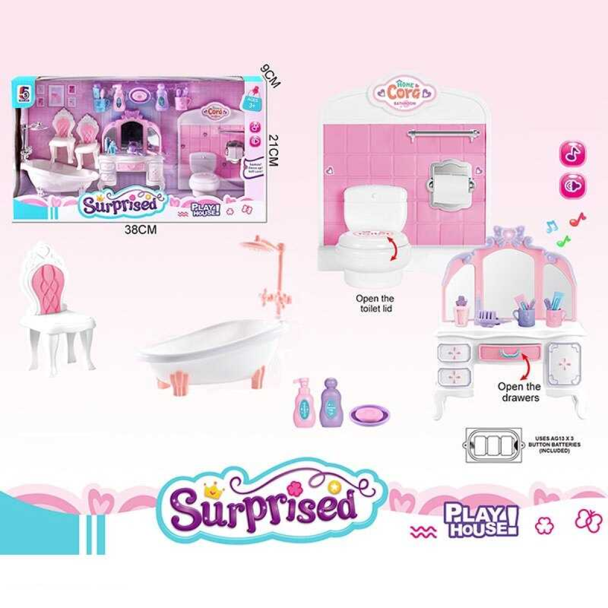 Набір меблів 5 S 631 (36/2) “Ванна кімната“, трюмо має підсвічування, мелодія, кришка унітаза підіймається, ванна, 2 стільчики, в коробці