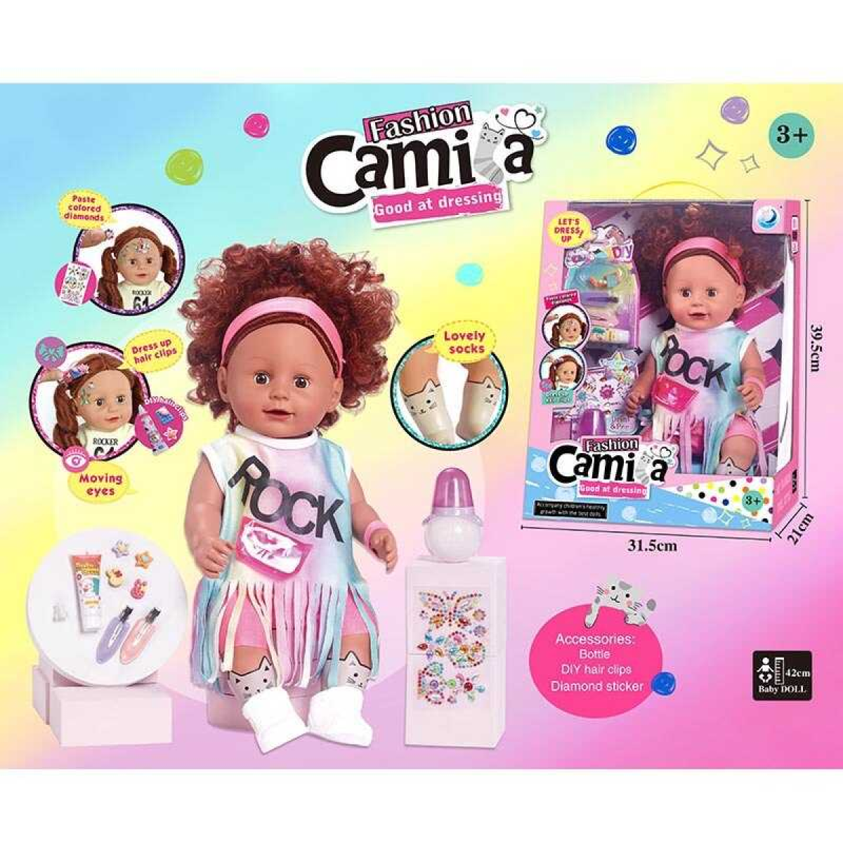 • Лялька A 766 B (12/2) висота 42см, п’є, ходить на горщик, заплющує очі, пляшечка, стрази, заколки, в коробці