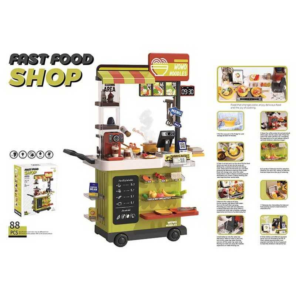 • Магазин 889-281 (4) висота: 102 см, 88 елементів, звуки, підсвічування, парогенератор, автоматична подача води, посуд, муляжі їжі, в коробці