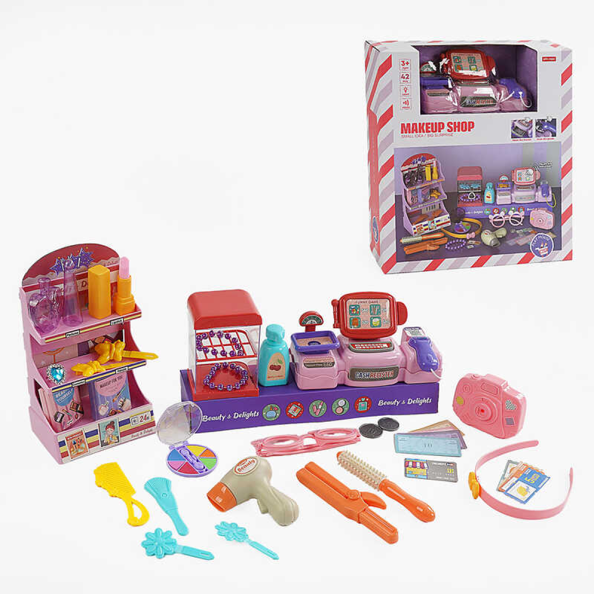 Магазин MW 5582 (16) касовий апарат, звук, репліки англ. мовою, підсвічування, стелаж, муляжі, прикраси, наліпки, гребінець, окуляри, в коробці