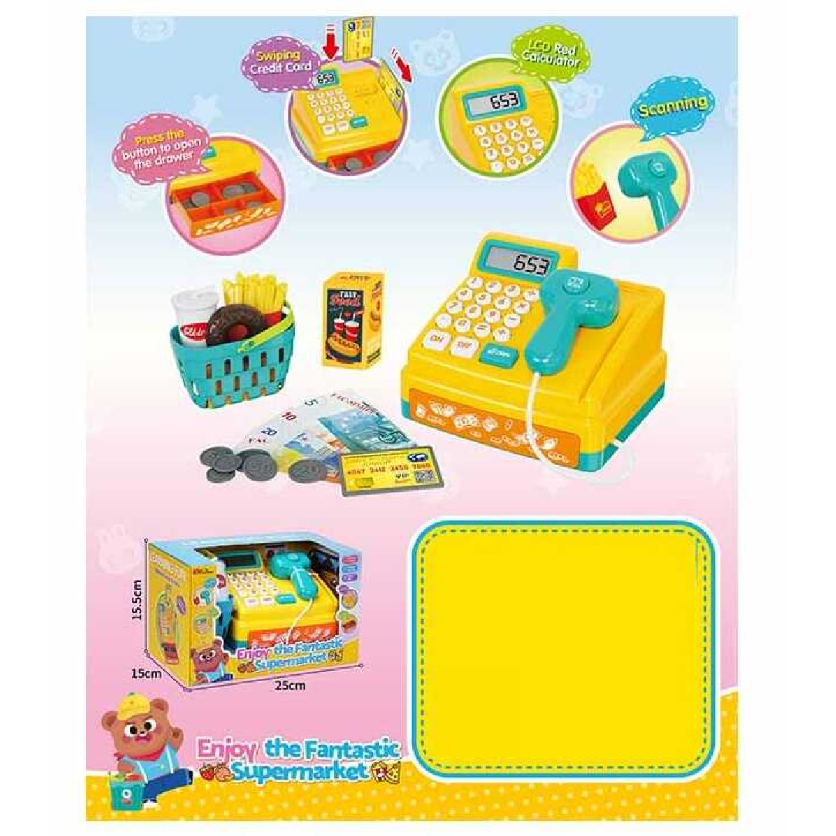 • Касовий апарат 35653 (12/2) підсвічування, звук, калькулятор, сканер, автоматичне висування шухляди, кошик, муляжі продуктів, монет, купюр, кредитної картки, в коробці