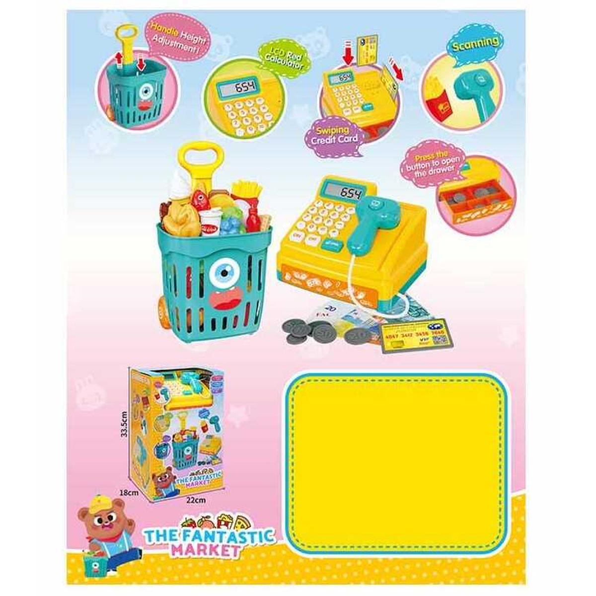 Касовий апарат 35654 (8/2) звуки, підсвічування, калькулятор, муляжі грошей, муляжі продуктів, кошик для супермаркету, в коробці