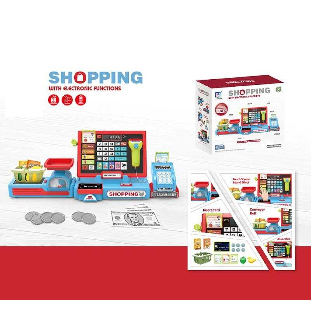 Касовий апарат 818-393 M (20) звуки, підсвічування, калькулятор, висувна шухлядка, муляжі продуктів і грошей, в коробці