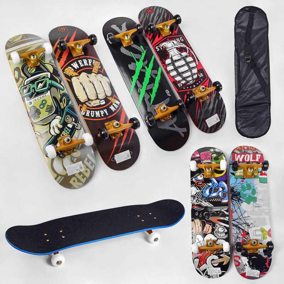 Скейт дерев“яний S 00675 (6) 6 видів, колеса PU, діаметр 5.5 см, підшипники ABEC-7, підвіска – алюміній, амортизатор PU, в сумці