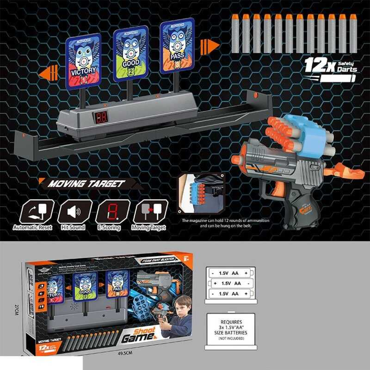 Тир LZ 087 (18) механічний пістолет, 12 м’яких патронів, електронна мішень, підсвічування, звуки, автоматично рахує влучання, рухається, в коробці