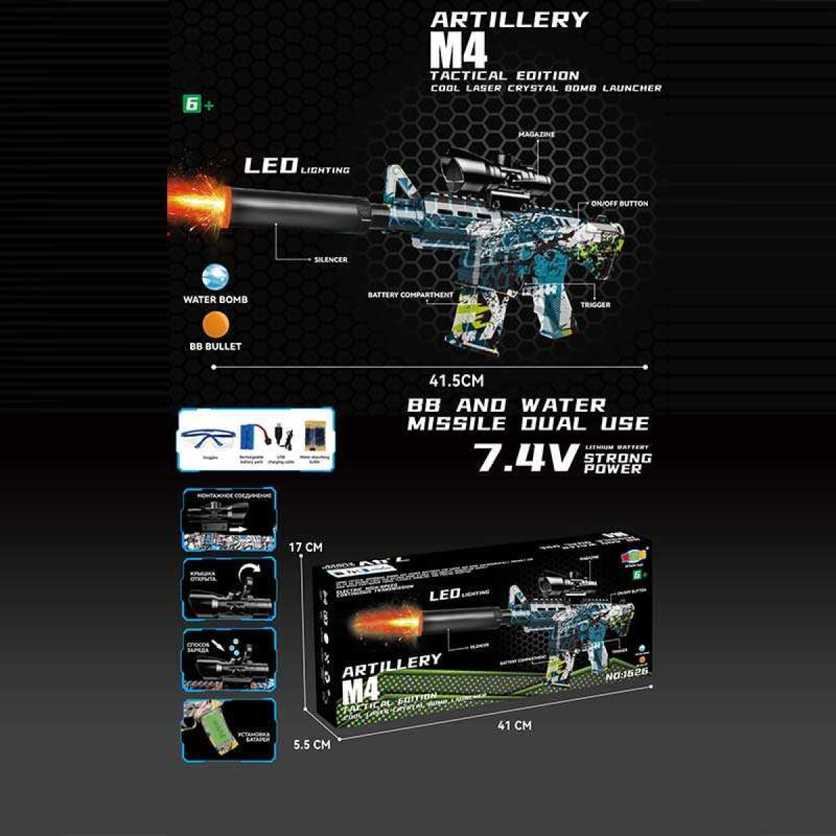 Автомат 1626-3 (36) автоматичний принцип роботи, акумулятор 7.4 V, стріляє орбізами, глушник з підсвічуванням, захисні окуляри, в коробці