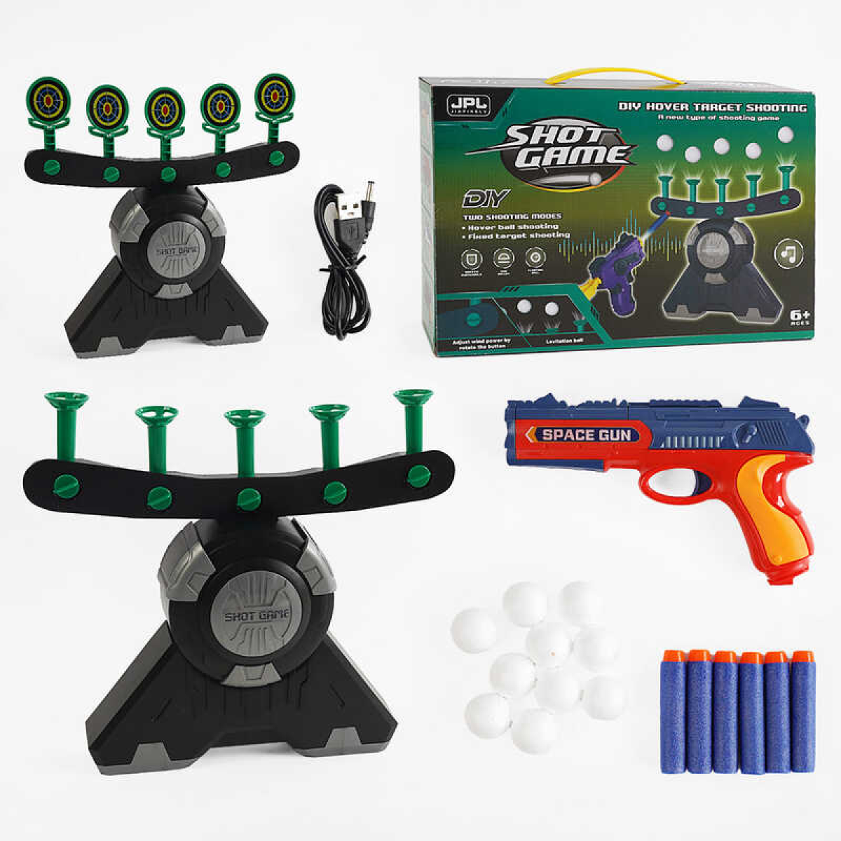 Повітряний тир 19891 В (24) м“які патрони, левітуючі кульки, 5 мішеней, регуляція потужності повітря, механічний пістолет, в коробці