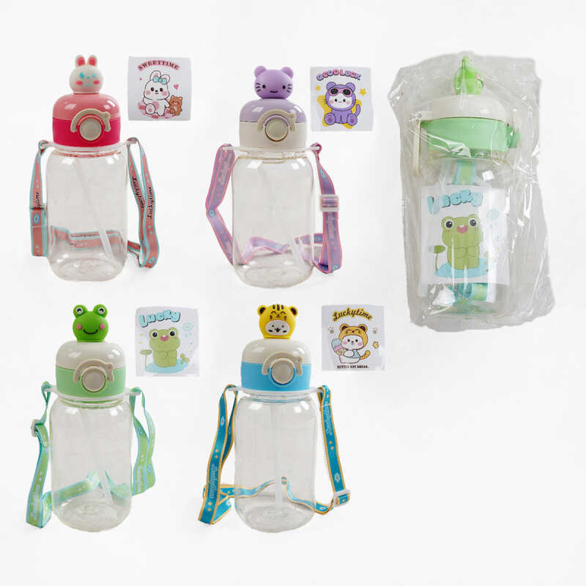 Пляшка для води C 69359 (80) 600 мл, пластикова, наліпки, ремінець, трубочка, пластикова застібка із запобіжником, в пакеті, ВИДАЄТЬСЯ ТІЛЬКИ МІКС ВИДІВ