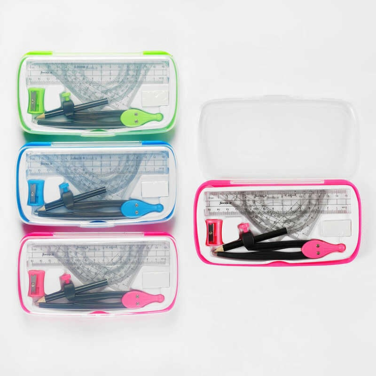Набір для креслення C 62057 (96) ЦІНА ЗА 1 ШТУКУ, циркуль, лінійка 15 см, 2 косинці, транспортир, гумка, стругачка, олівець, в пакеті