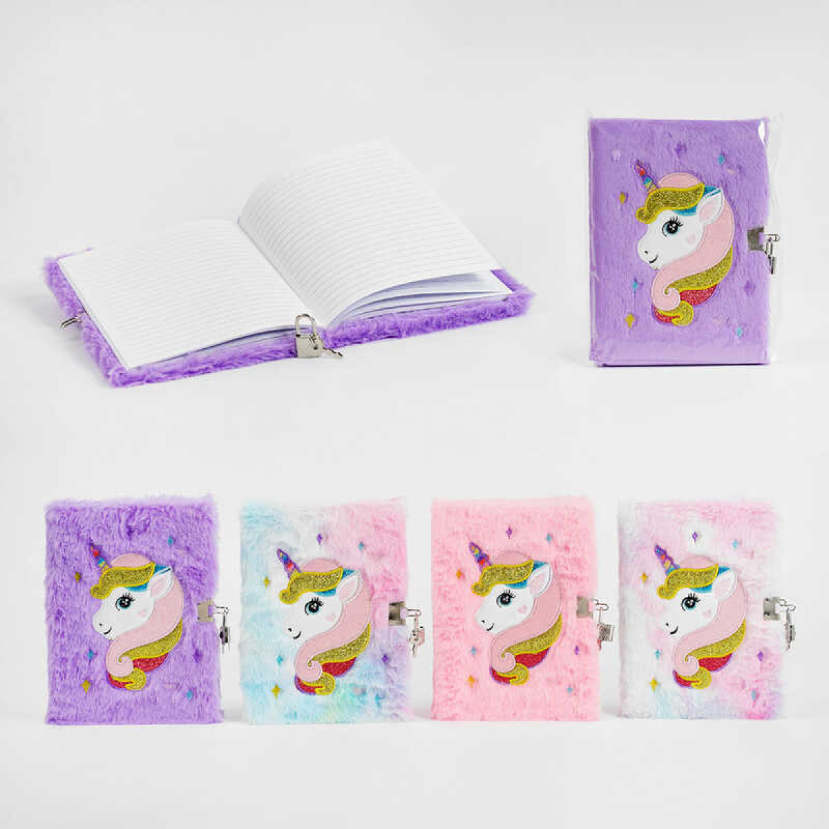 Блокнот М 15019 (120) 4 кольори, хутряна обкладинка, вишивка, єдиноріг, замочок, у лінійку, у пакеті, ВИДАЄТЬСЯ ТІЛЬКИ МІКС ВИДІВ