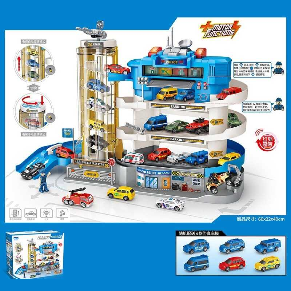 Трек E 7004 (4) “Поліція”, світло, звук, автоматичний ліфт, 4 поверхи, 6 машинок, ігрова фігурка, в коробці