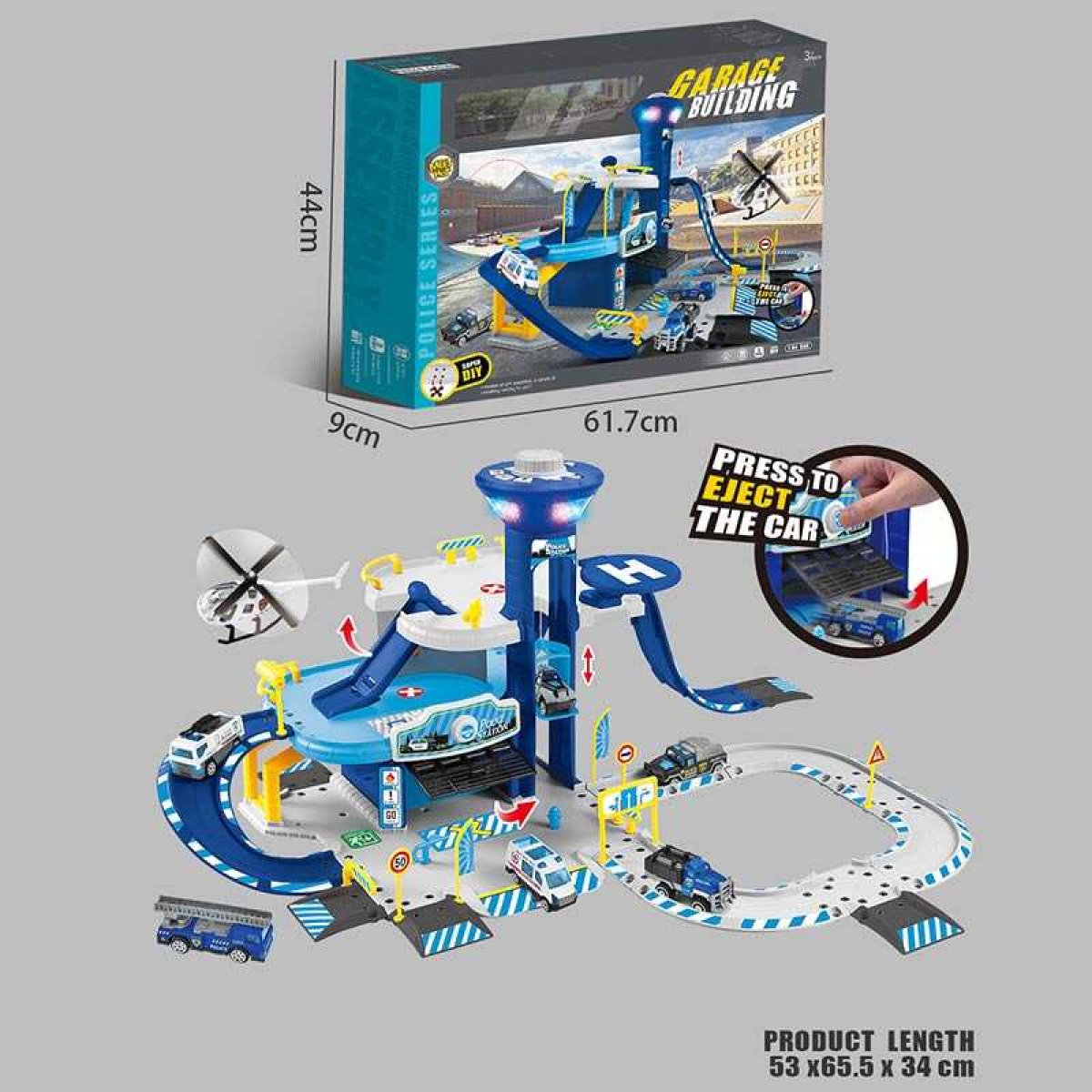 Трек MH 102 (10) парковка, довжина 53см, підсвічування, звукові ефекти, ОЗВУЧУВАННЯ АНГЛІЙСЬКОЮ, 3 металопластикові моделі спецтехніки, в коробці