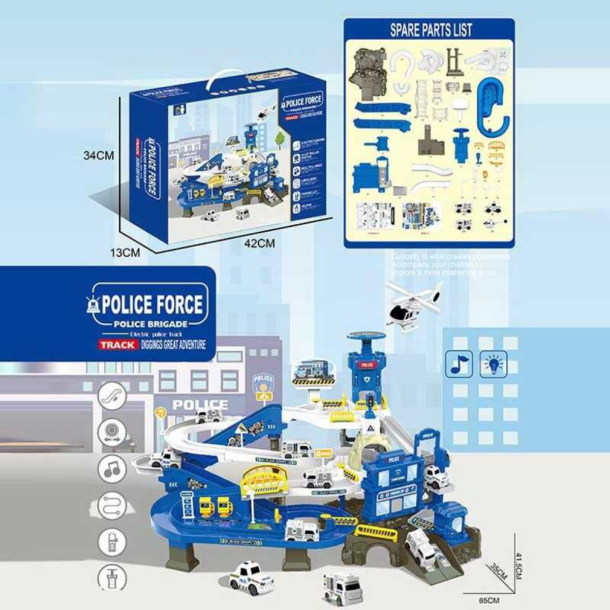 Трек ZX 005 A (12) “Поліцейська станція”, звук, підсвічування, механічний ліфт, автоматичний підйомник, 4 моделі мінітранспорту, в коробці