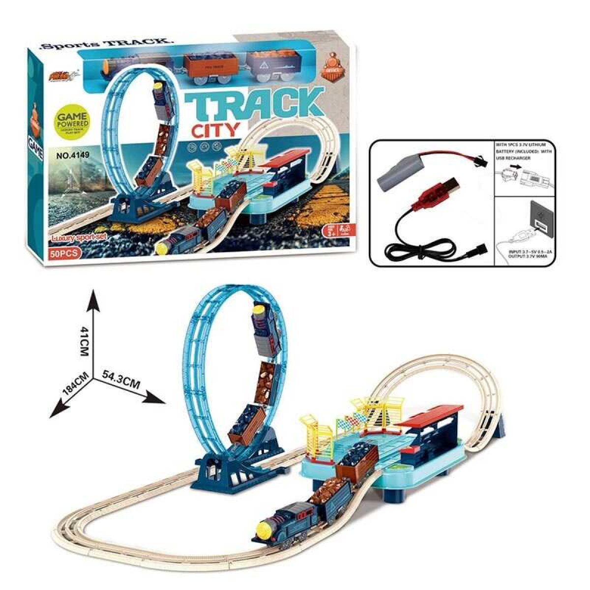 Залізниця 4149 B (18) 50 елементів, локомотив, 2 вагони, мертва петля, платформа, акумулятор, USB-кабель, в коробці