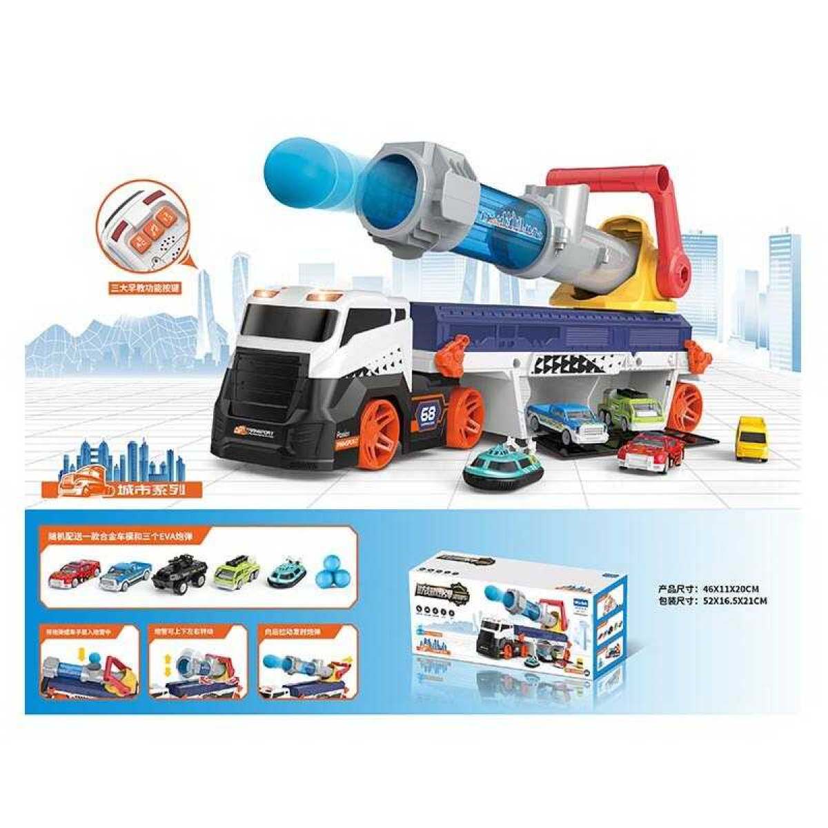 Трейлер E 7007 Штрих = 60274 (12) підсвічування, озвучування англійською, металопластикова машинка, механічний запускач, гараж, м“які кульки, в коробці