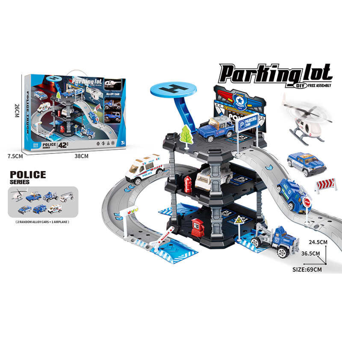 • Трек 666-06 (36) 2 металопластикові машинки, гелікоптер, 3 рівні, муляжі оточення, наліпки, в коробці