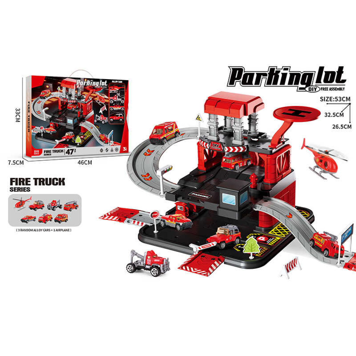 • Трек 666-10 (24) 3 металопластикові машинки, гелікоптер, 3 рівні, муляжі оточення, наліпки, в коробці