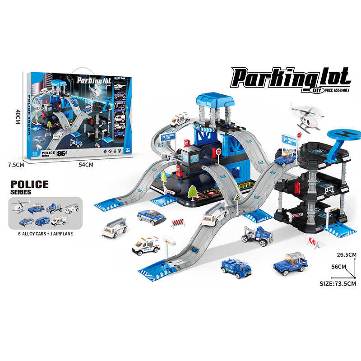 Трек 666-15 (18) 6 металопластикових машинок, гелікоптер, 3 рівні, муляжі оточення, наліпки, в коробці