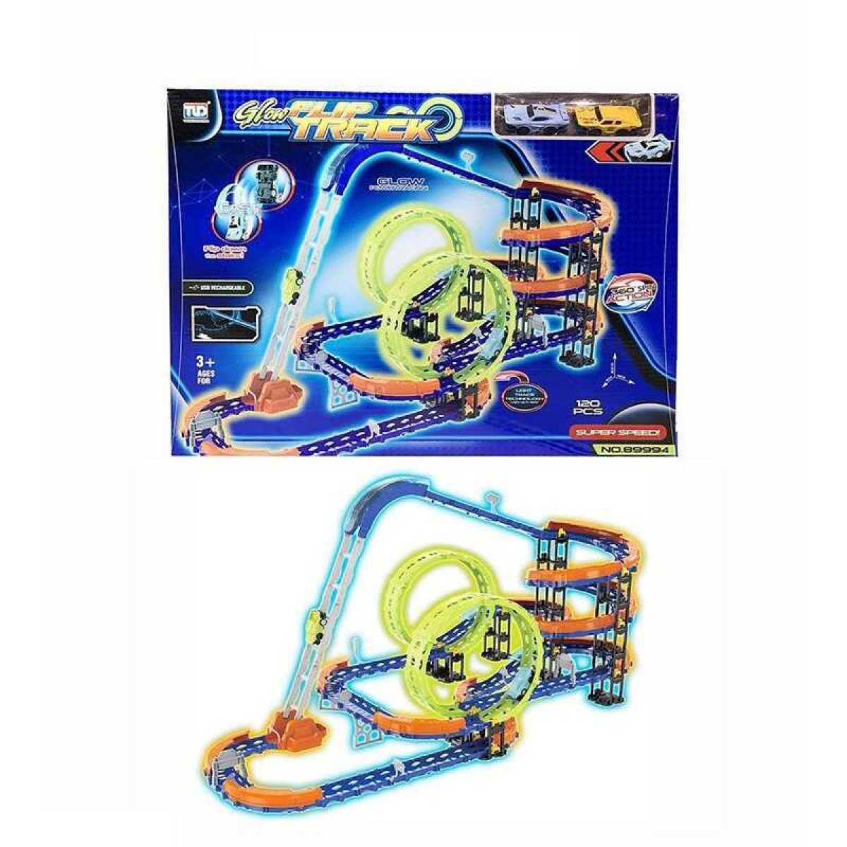 Трек 89994 (12) 122 елементи, 2 машинки із вбудованими акумуляторами, підсвічування, світиться у темряві, трюки, муляжі оточення, в коробці