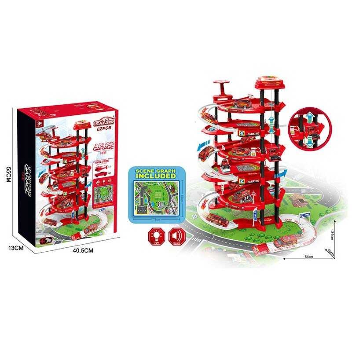 Трек-парковка 660 A-325 (10/2) масштаб - 1:64, автоматичний підіймач, підсвічування, звукові ефекти, металопластикові машинка і вертоліт, наліпки, мапа, в коробці