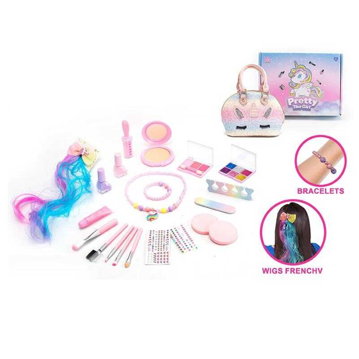 Набір косметики 2621 B (36) сумочка, пудрениця із дзеркальцем, тіні, глітер, 2 лаки, розділювач для пальців, пилочка, штучна прядка волосся, в коробці