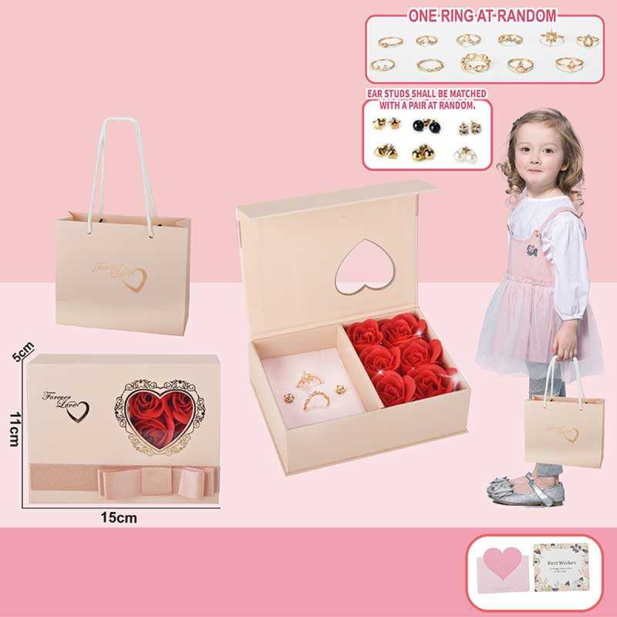 Набір прикрас 769-9 (144/2) магнітна застібка, 2 каблучки, сережки, бутони троянди, листівка, паперовий пакет, в коробці