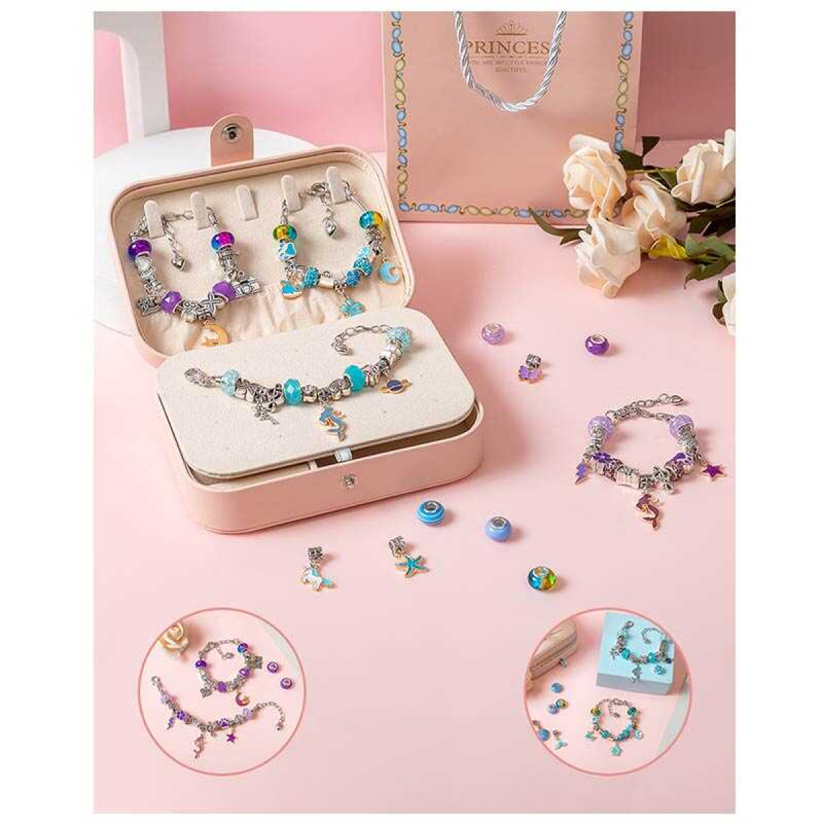 Набір прикрас DLS 1132 (48) 12 основ браслетів, шарми, шкатулка, в коробці