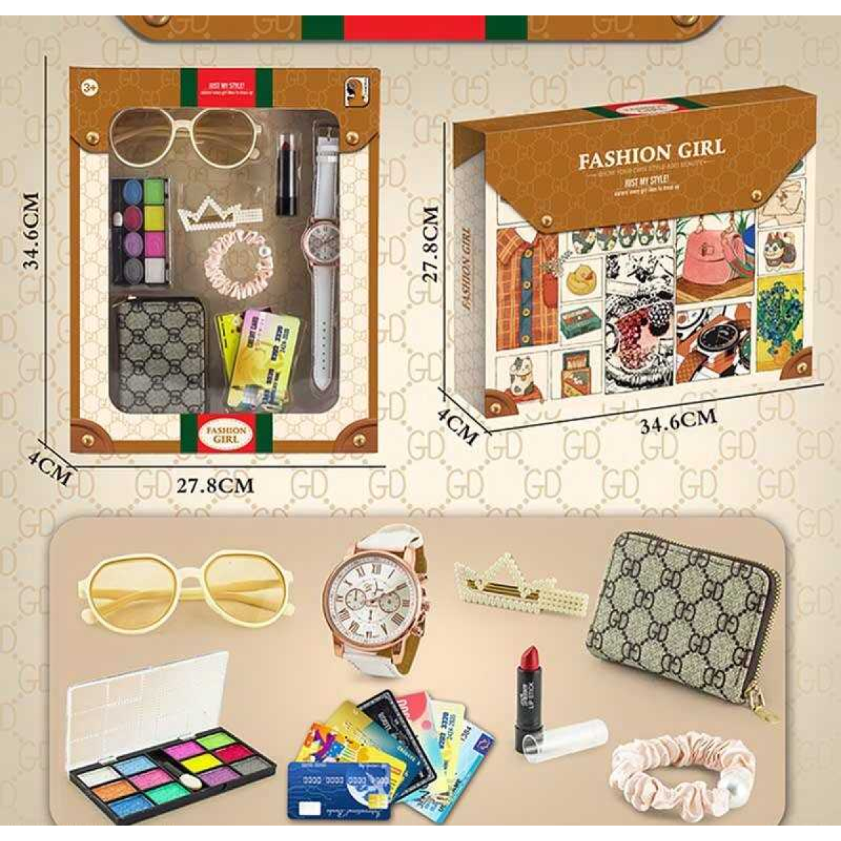 Набір прикрас K 4 (60) годинник, окуляри, резинка та шпилька для волосся, помада, гаманець, тіні для повік та імітація банківських карток, в коробці