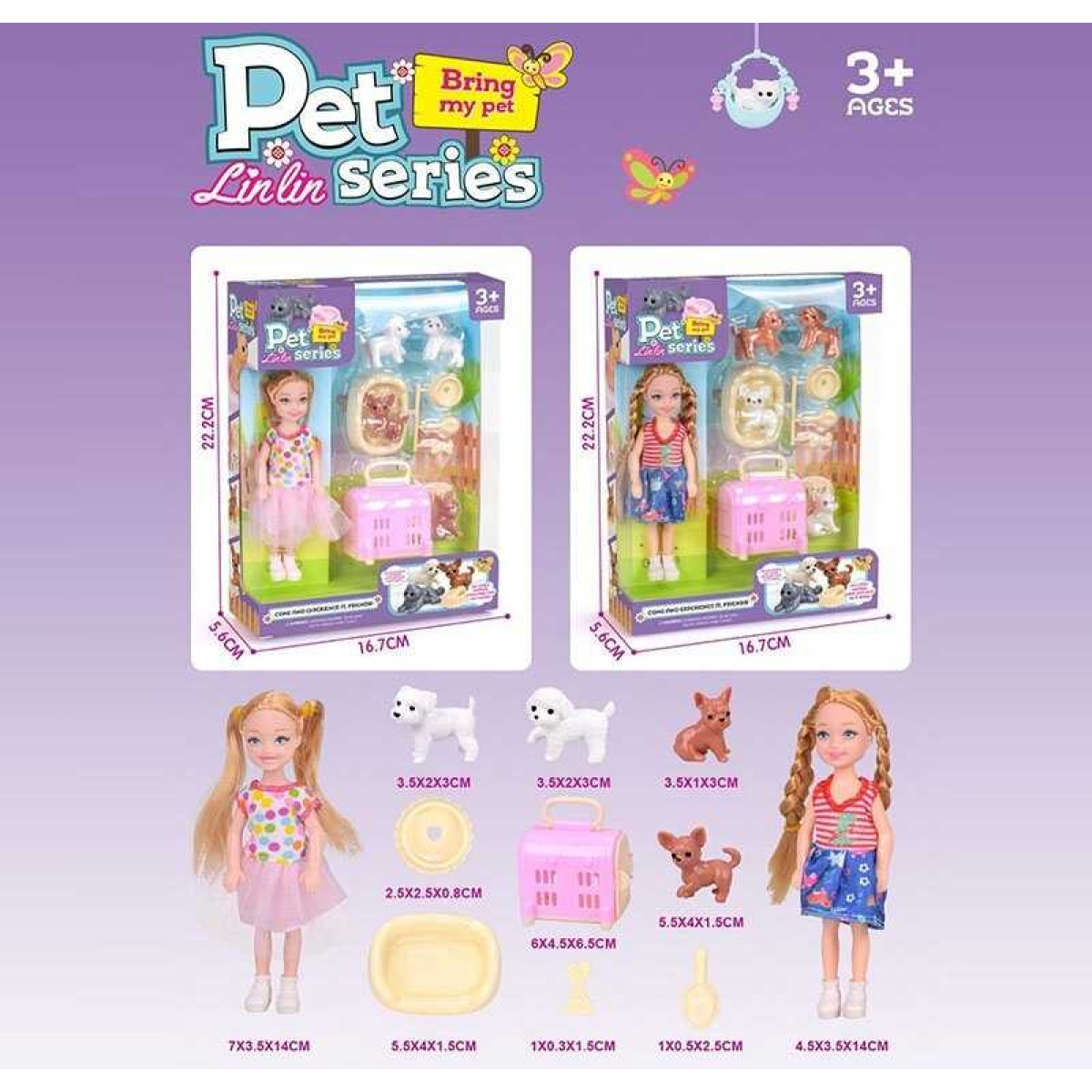 • Лялька L 5-9 (144/2) 2 види, висота 14 см, лялька, 4 собачки, лежанка, миска, кісточка, щітка, переноска, в коробці