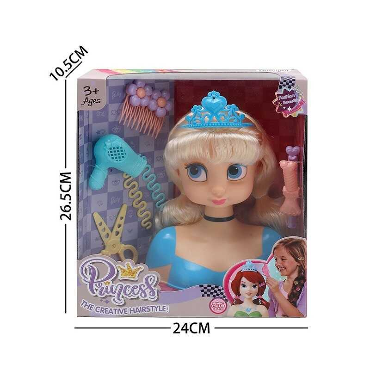 Манекен для зачісок LK 1713 A (48/2) аксесуари, корона, фен, ножиці, шпильки, в коробці