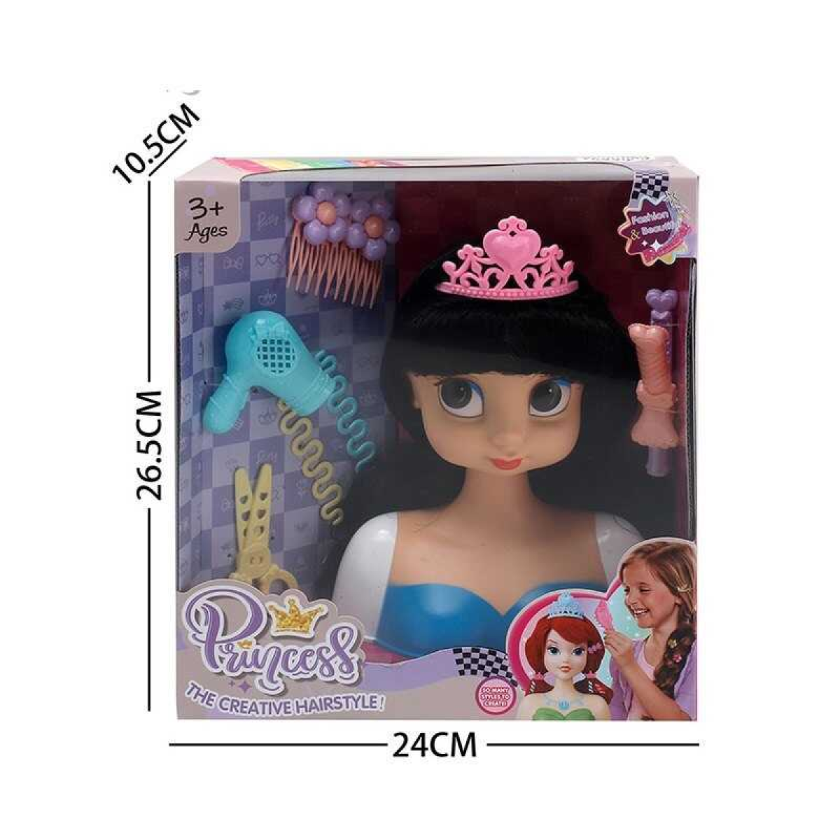 Манекен для зачісок LK 1713 C (48/2) аксесуари, корона, фен, ножиці, шпильки, в коробці