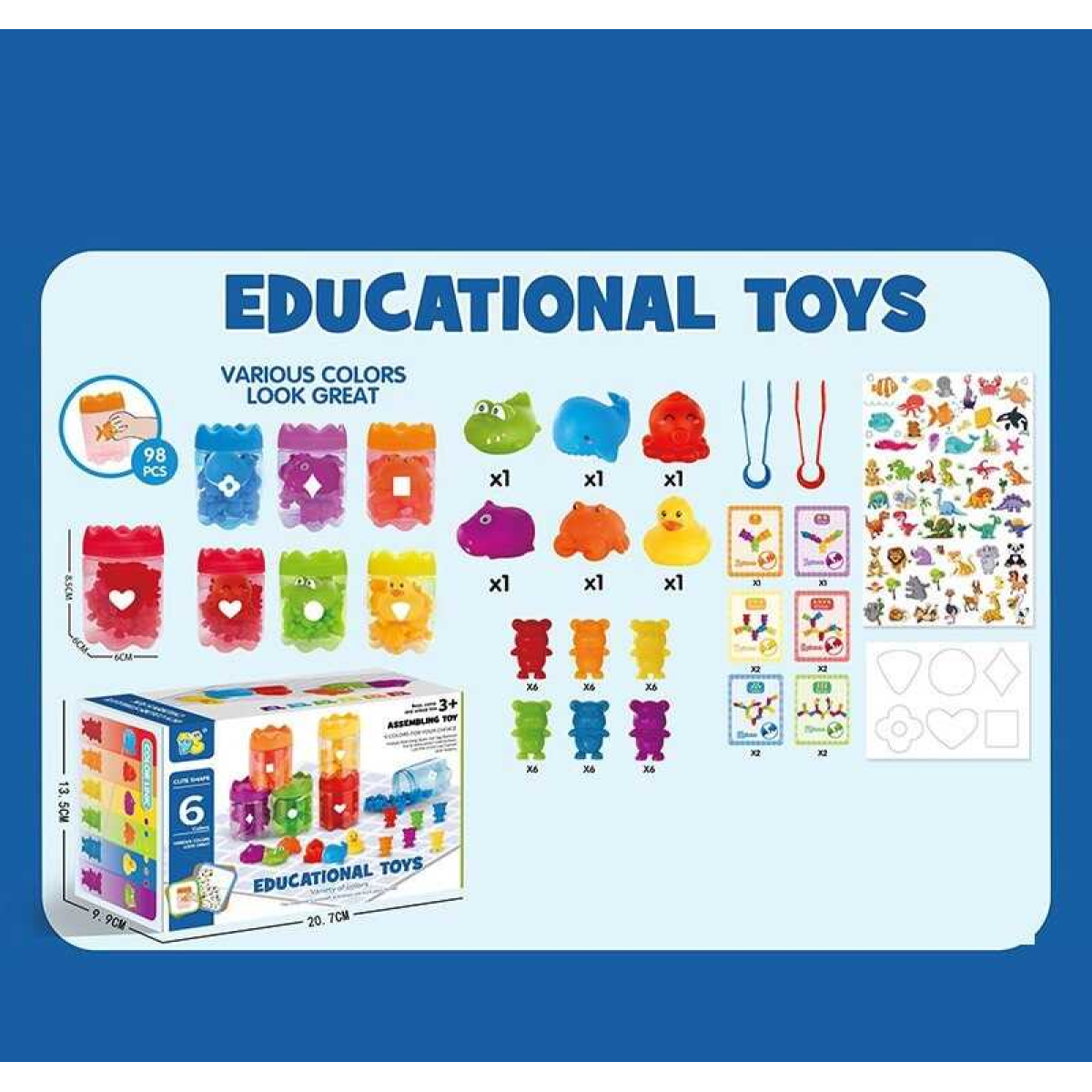 Логічна гра 2188-86 (40) сортер+конструктор, 98 елементів, 6 контейнерів, фігурки тварин, картки із завданнями, пластикові щипці, в коробці
