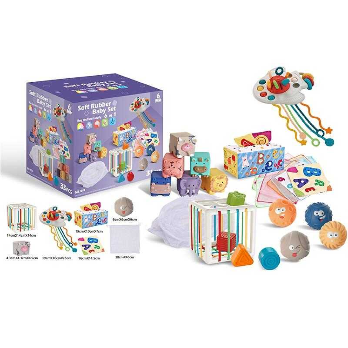 Набір для розвитку 1294 (18) 31 елемент, брязкальця, кубики, прорізувачі, пальчикові ігри, м’ячики, текстильні серветки, мішечок, куб із формами, в коробці