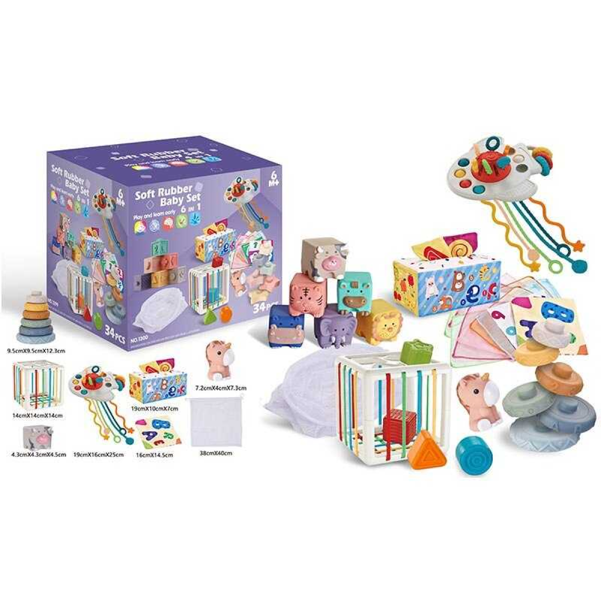 • Набір для розвитку 1299 (18) 34 елементи, кубики, брязкальця, прорізувачі, фігурка, пірамідка, серветки, мішечок, куб із формами, в коробці
