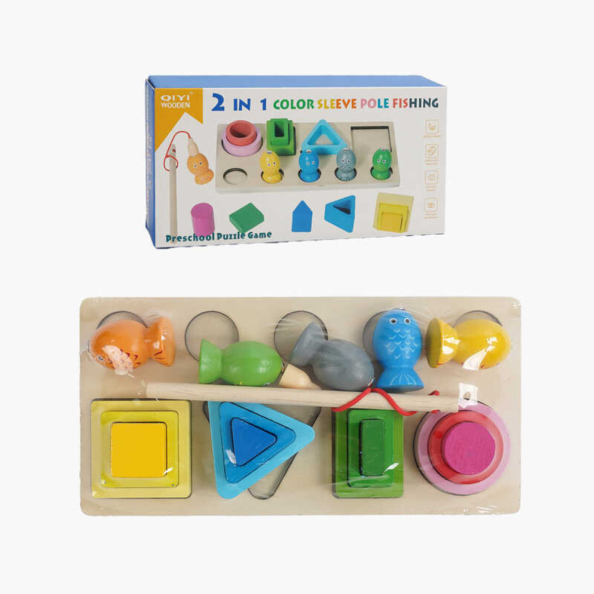 Логічна гра C 68834 (80) 2 в 1, дерев“яна, магнітна риболовля, сортування фігурок, ігрова платформа, рибки, вудка, геометричні фігури, в коробці