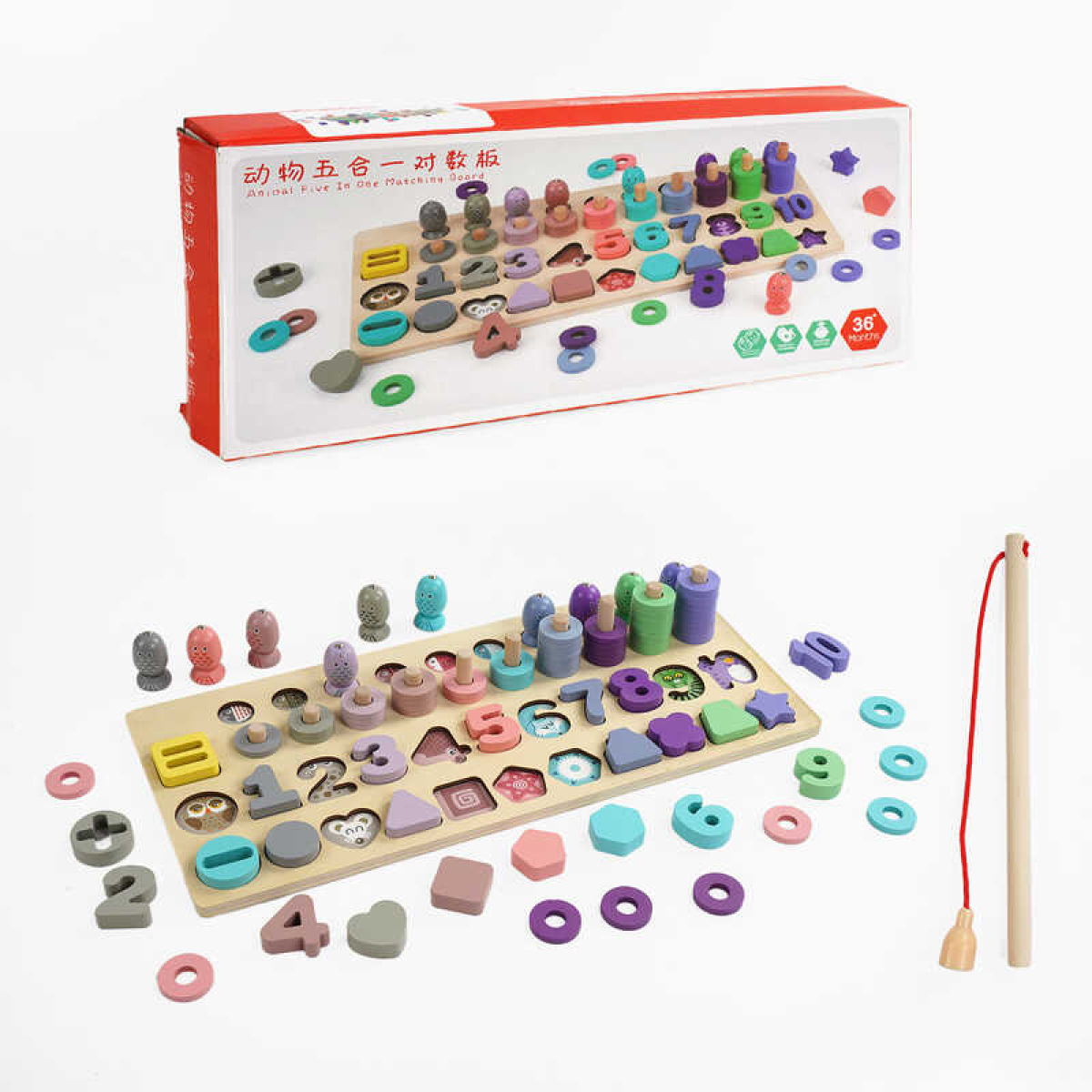 Логічна дерев’яна дошка C 65782 (24) магнітна риболовля, кілочки з кільцями, сортер, цифри, геометричні фігури, в коробці