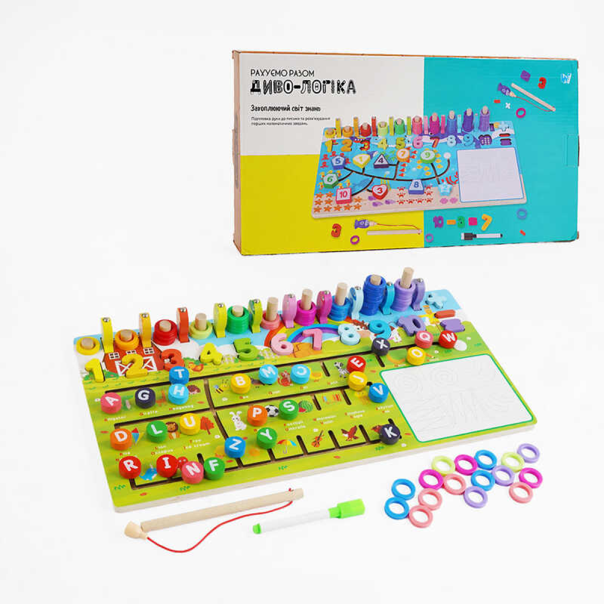 Логічна дерев’яна дошка “Диво-логіка” 47699 №1 “Англ.абетка“(24) “WToys“ магнітна риболовля,пальчиковий лабіринт, дошка для малювання, в коробці