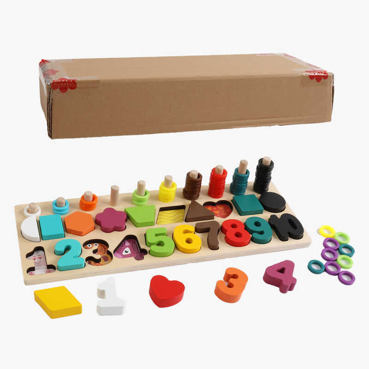 Дошка логічна C 53797 (24) дерев“яна, сортер, дерев“яні кілочки, кольорові кільця, цифри, фігури, в коробці