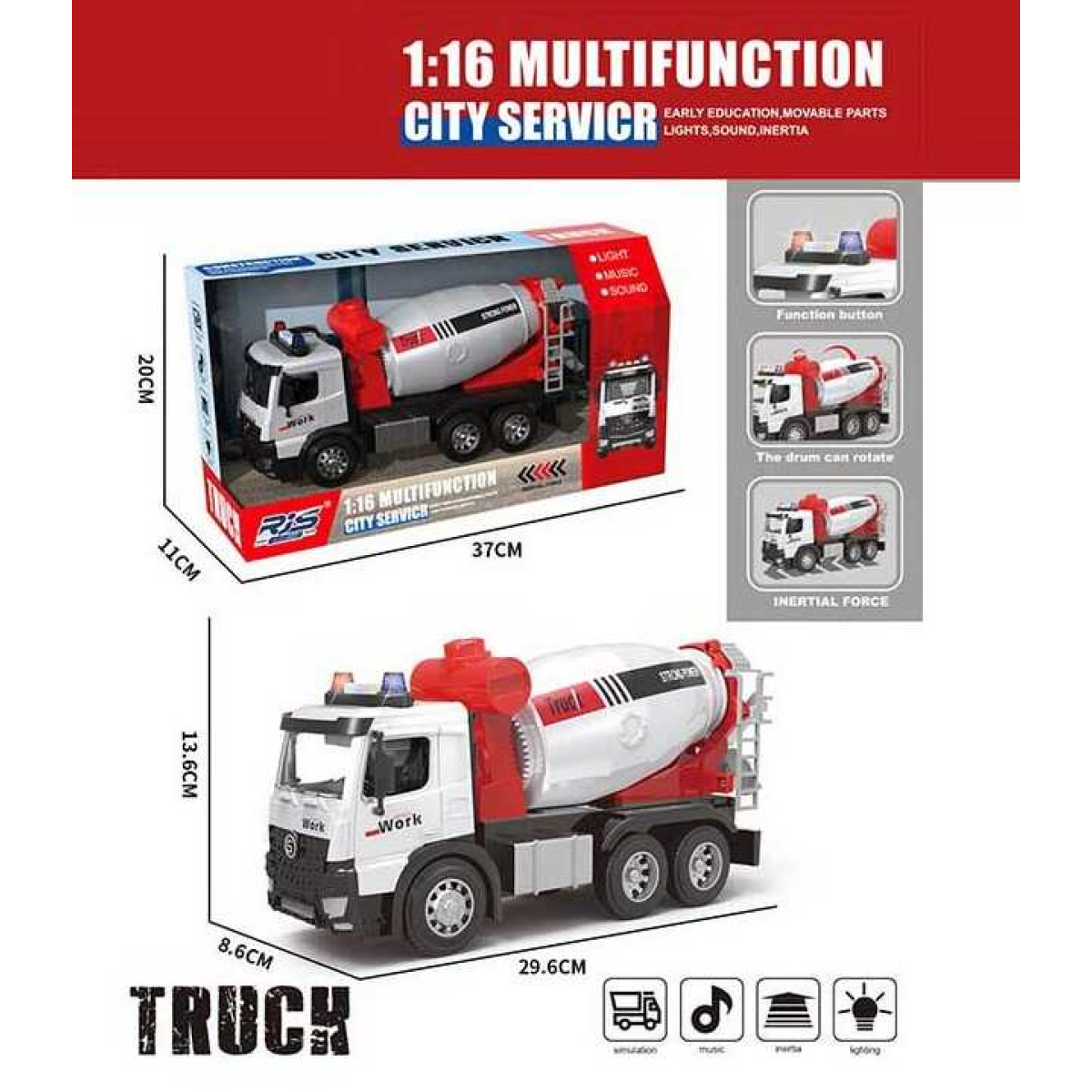 Спецтехніка GX 02 A (24) бетонозмішувач, масштаб 1:16, світло, звук, інерція, механічний обертовий барабан, гумові шини, в коробці