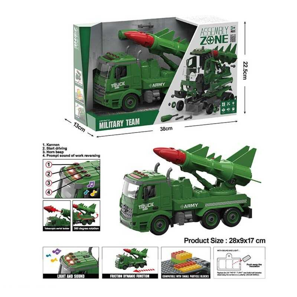 Спецтехніка YW 9091 C (24/2) військова машина, підсвічування, звукові ефекти, механічне обертання платформи по колу, інерція, телескопічна ракетна установка, тріскачка, муляжі ракет, викрутка, 2 насадки, у коробці