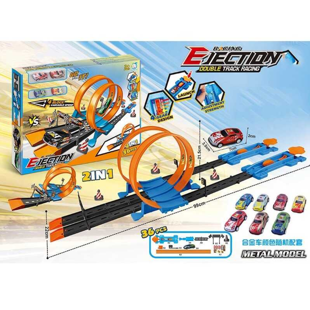 • Трек 652 H4 (36/2) 36 елементів, 4 металопластикові машинки, запускачі, наліпки, декоративні елементи, в коробці