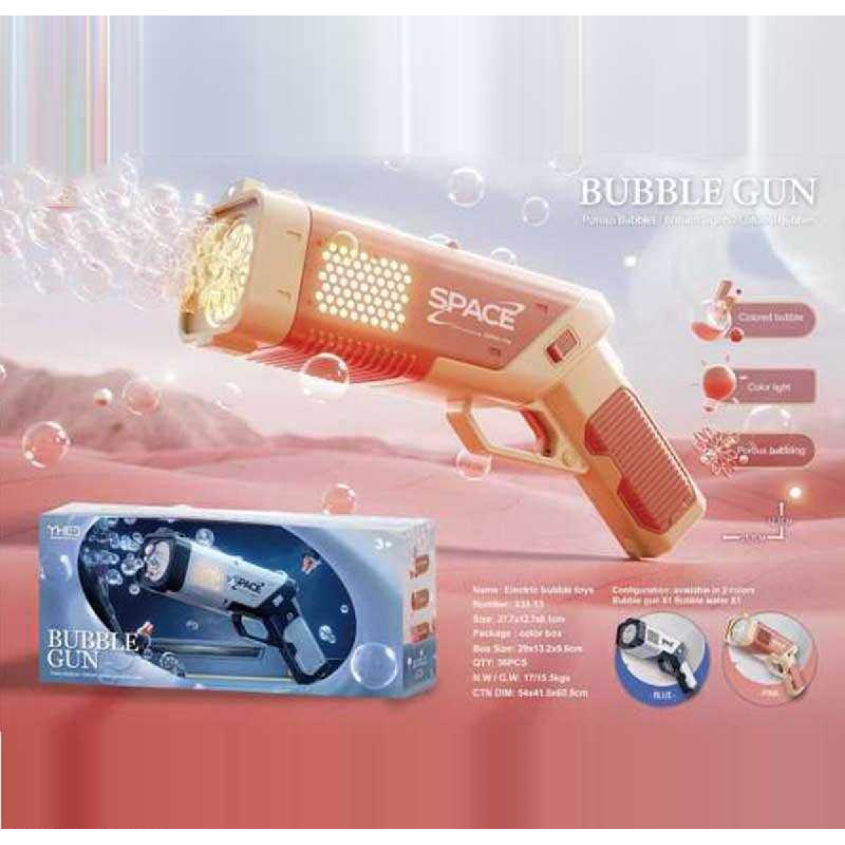 Пістолет з мильними бульбашками 333-13 (36) 2 кольори, автоматичний принцип, 2 пляшки мильного розчину, на батарейках, підсвічування, в коробці