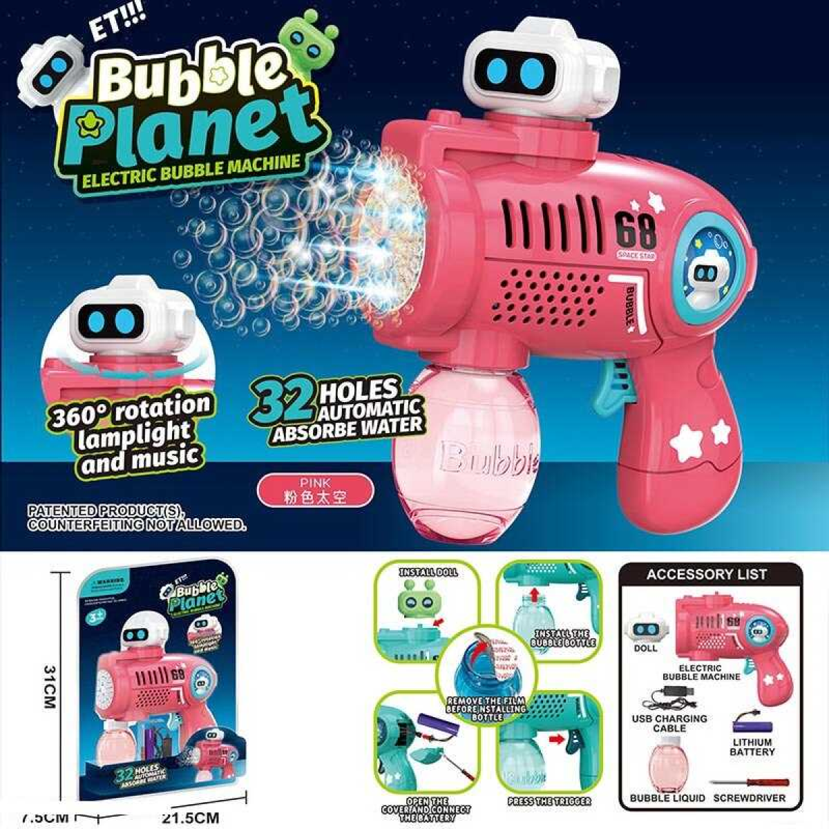 Пістолет з мильними бульбашками KB 1306 Штрих = 91344 (48/2) звук, підсвічування, ак. 3.7V, USB-кабель, пляшка з мильним розчином, в слюді