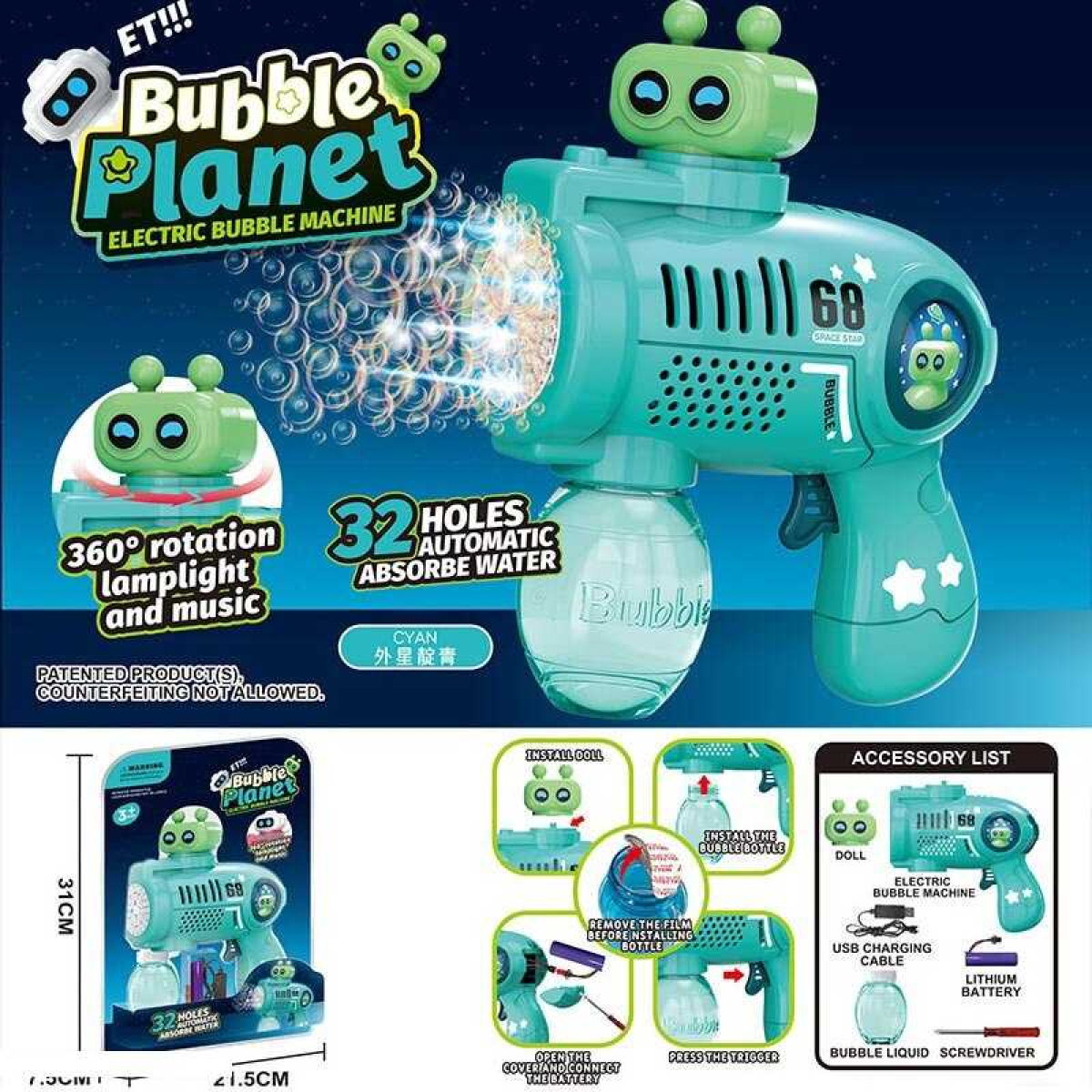 Пістолет з мильними бульбашками KB 1306 Штрих = 91351 (48/2) звук, підсвічування, ак. 3.7V, USB-кабель, пляшка з мильним розчином, в слюді