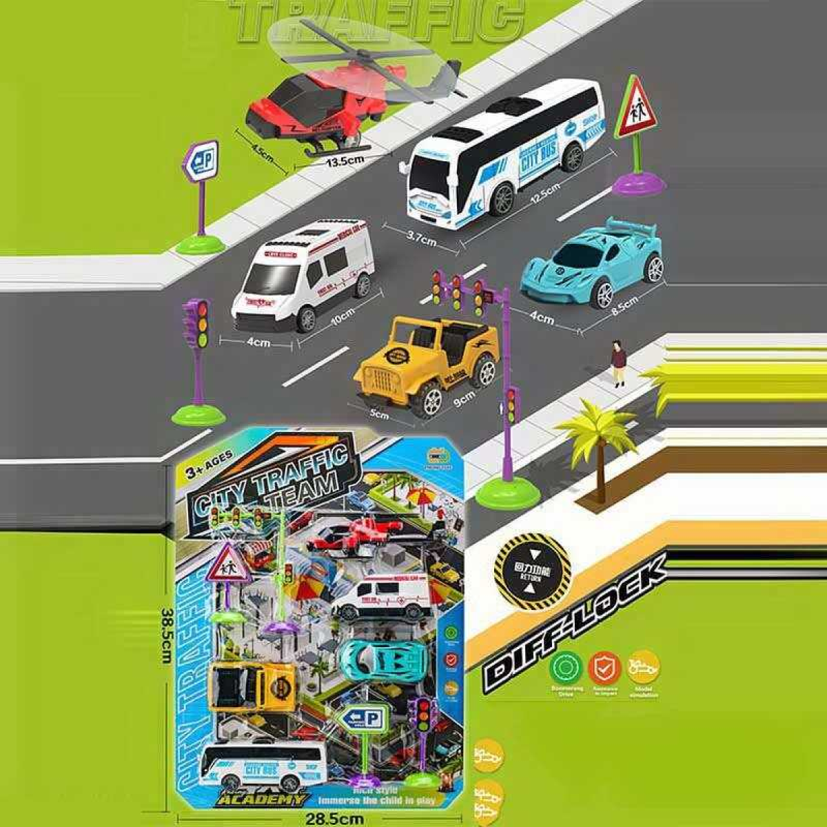 • Набір машин 24610 (96/2) автобус, вертоліт, джип, спорткар, швидка допомога, дорожні знаки, на листі