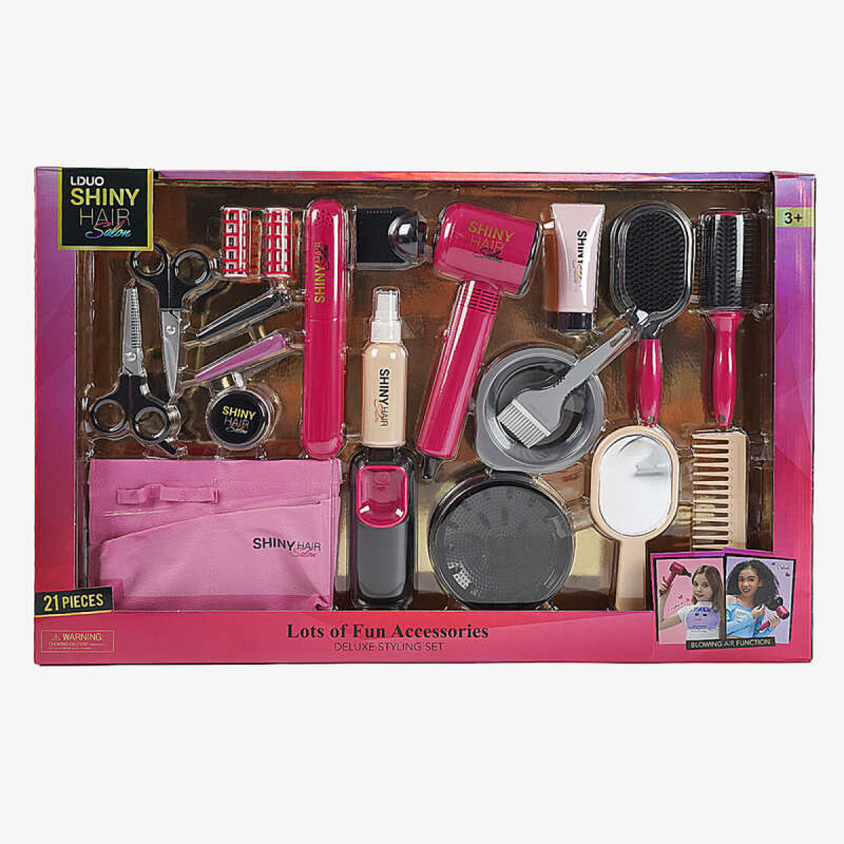Набір перукаря 626032 (12) 21 аксесуар, світло, звук, стайлер, фен видуває повітря, бігуді, заколки, щітки, гребінець, люстерко, у коробці