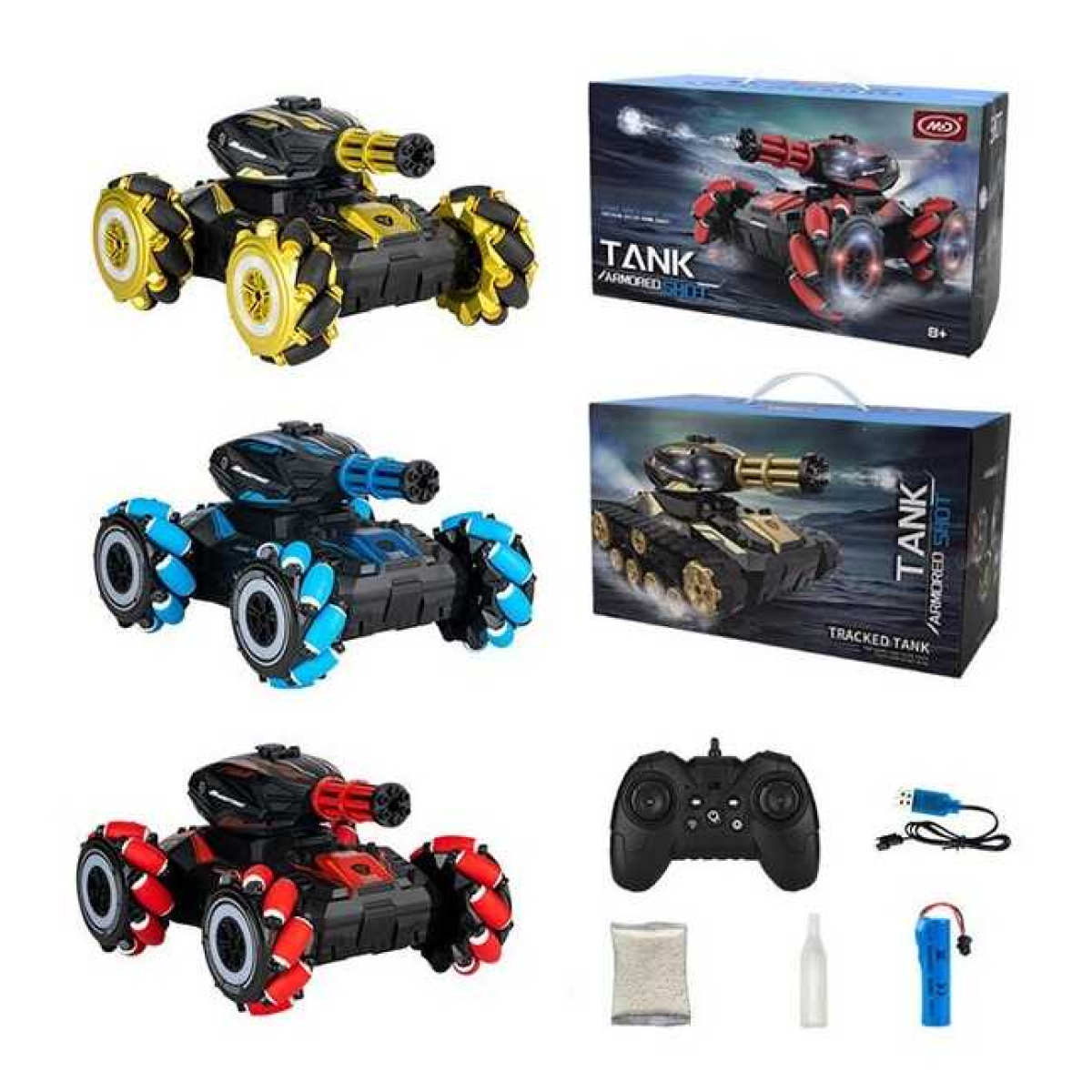 Танк на радіокеруванні MD 541 A (16) 3 кольори, роликові колеса, парогенерація, стріляє орбізами, підсвічування, орбізи, акум. 3.7V, музика, звуки, USB-кабель, пульт 2.4G, в коробці, ВИДАЄТЬСЯ ТІЛЬКИ МІКС ВИДІВ