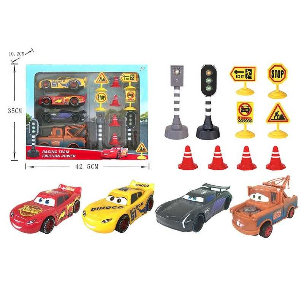 Набір машин 086 (16) 4 штуки, герої, інерція, світлофор та пристрій для фіксування швидкості на батарейках, дорожні знаки, в коробці