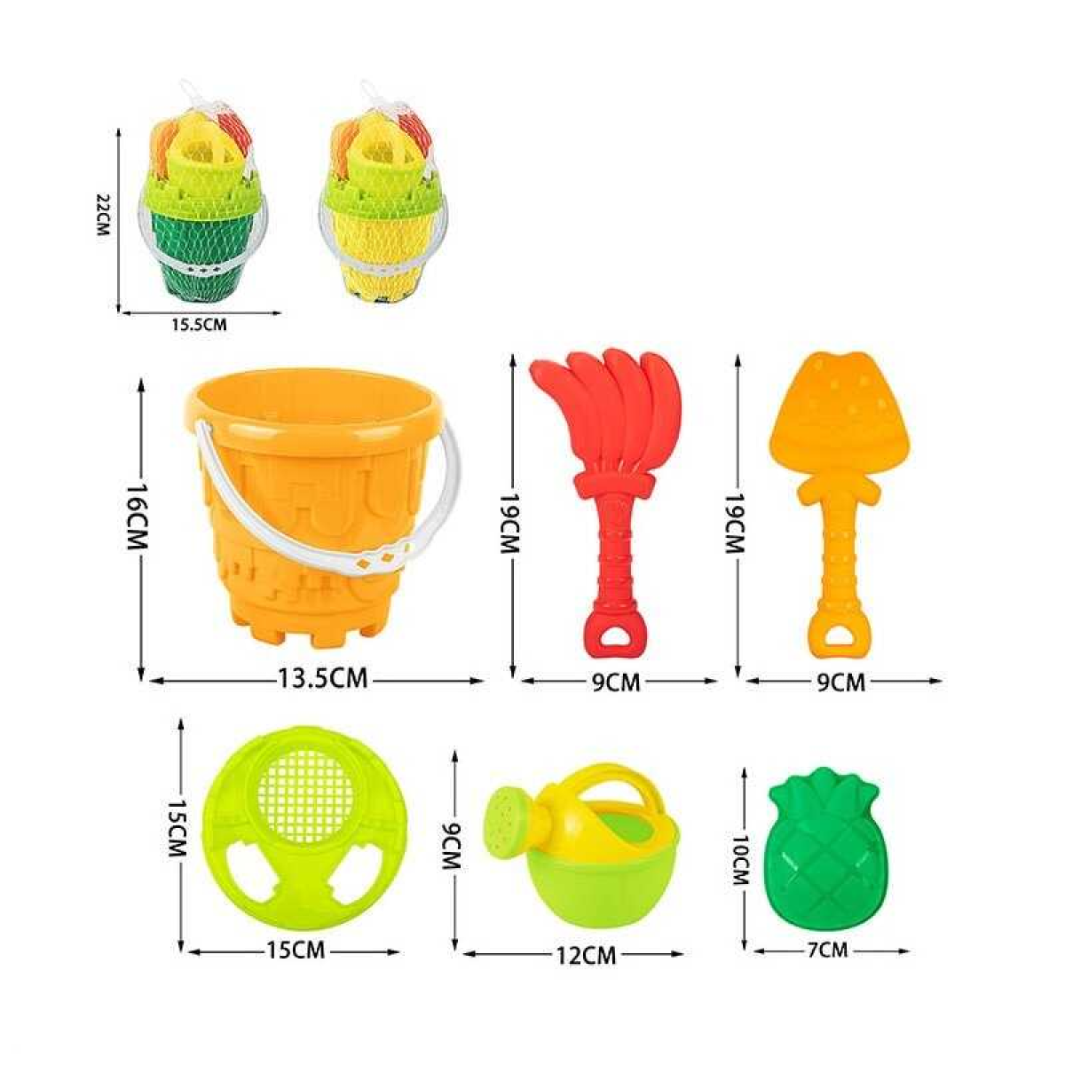 Пісочний набір 295-37 A (72/2) відерці, лопатка, граблі, форма для піску, лійка, сито, у сітці
